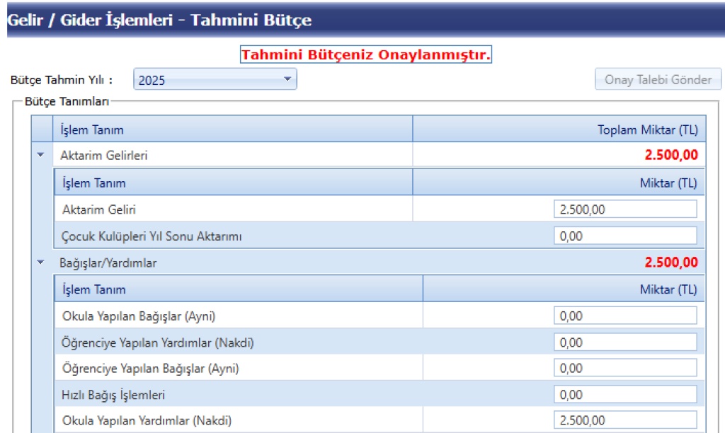 2025 yılı okulumuz Okul Aile Birliği Tahmini Geliri